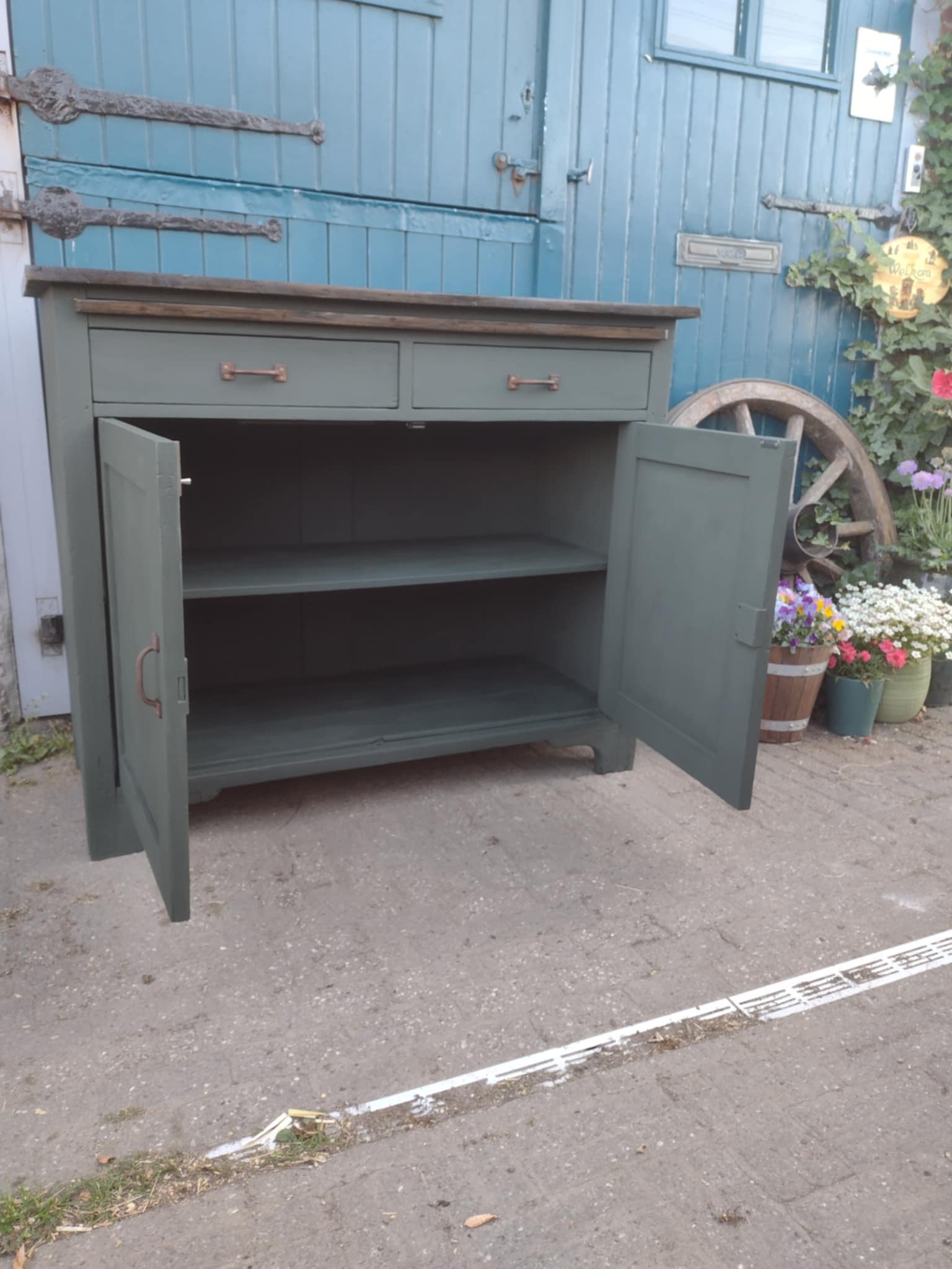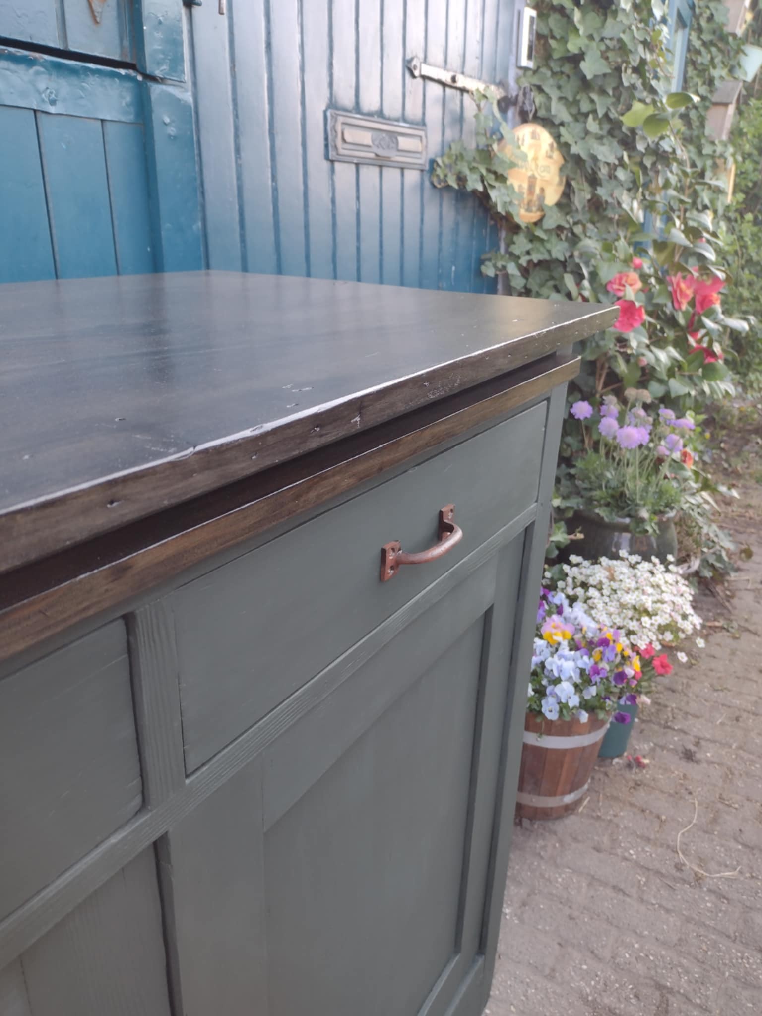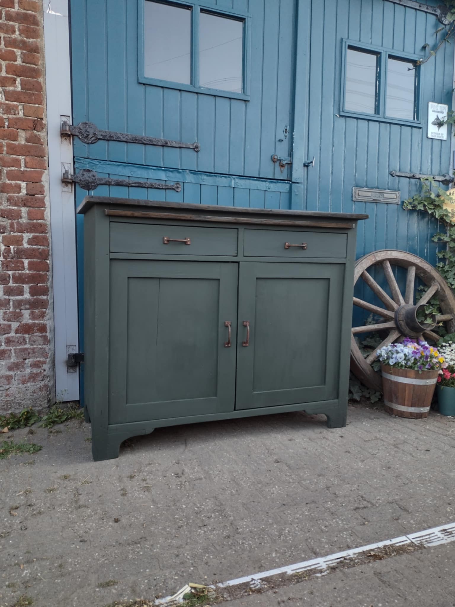 Deze stoere kast is in de kleur army groen. De kast heeft een uitschuifbaar blad dus ook ideaal te gebruiken als commode! De handgrepen zijn geroest staal. De houten bladen gezandstraald zijn in de kleuren black wash. Per direct leverbaar!