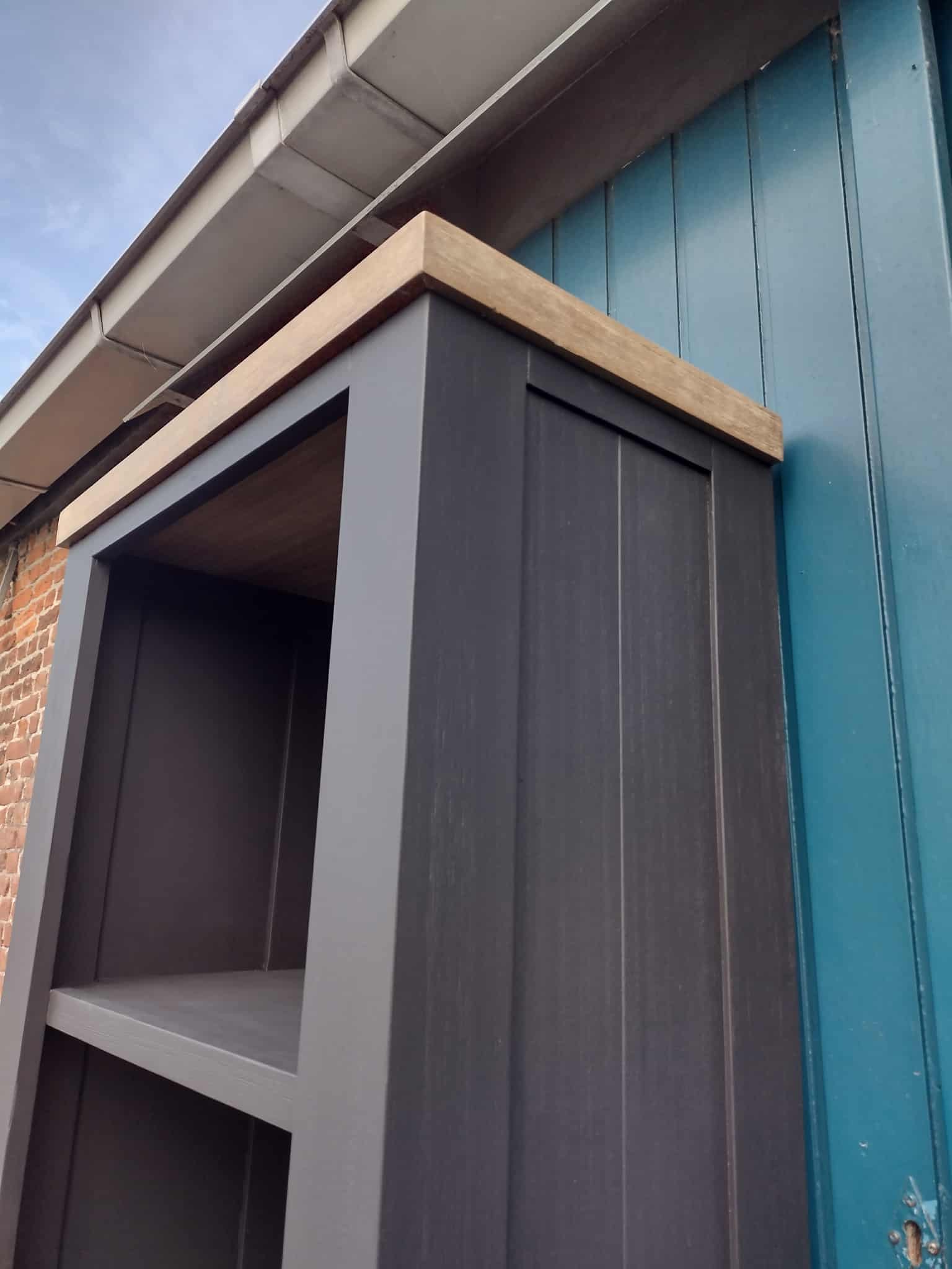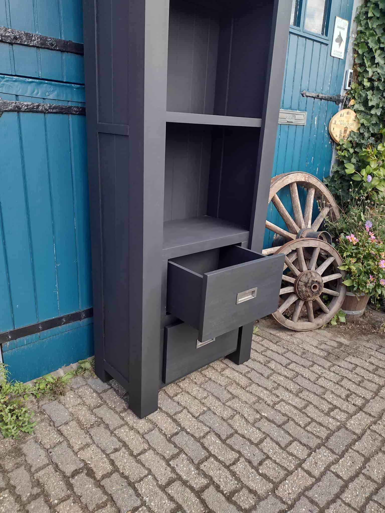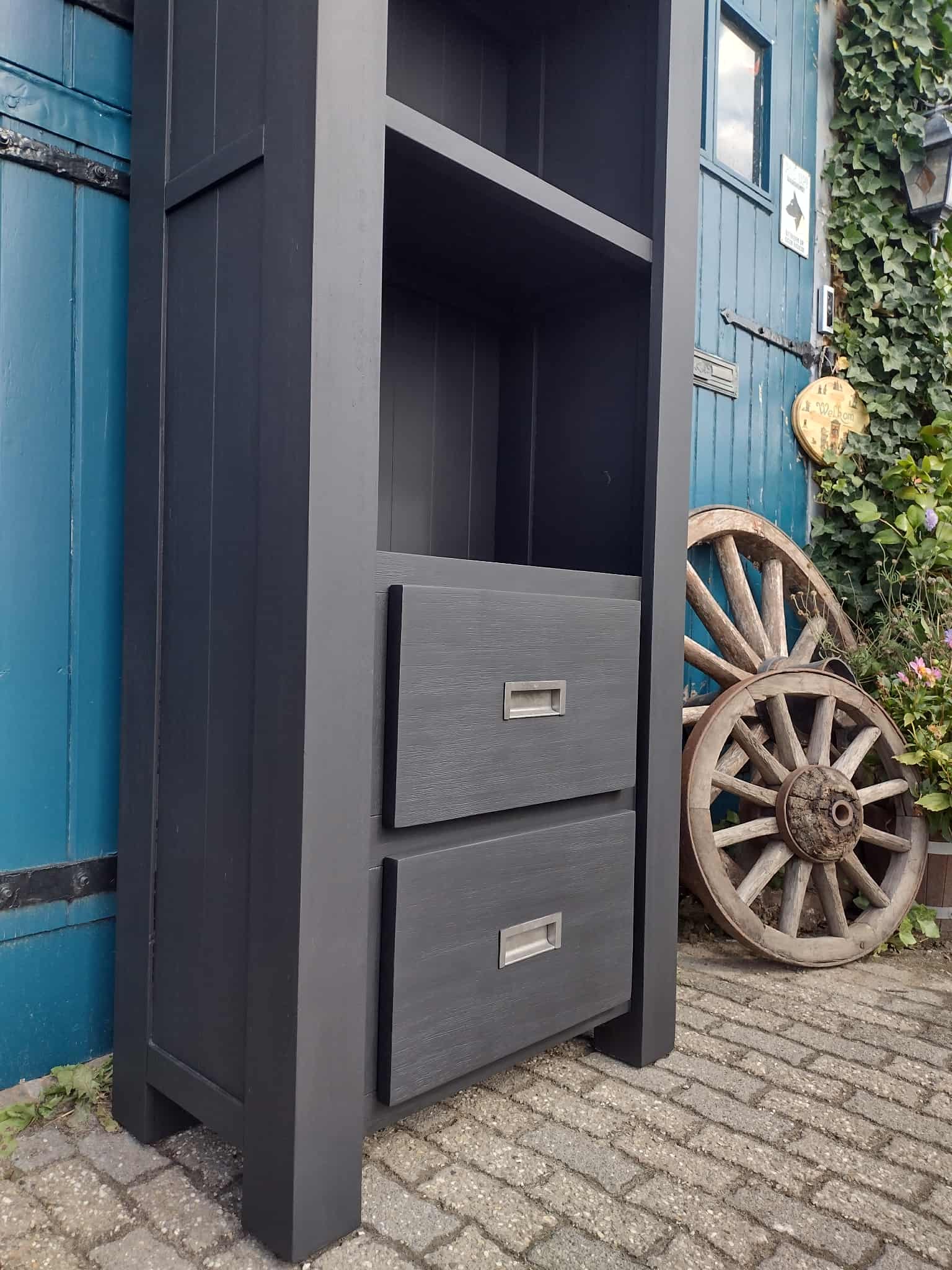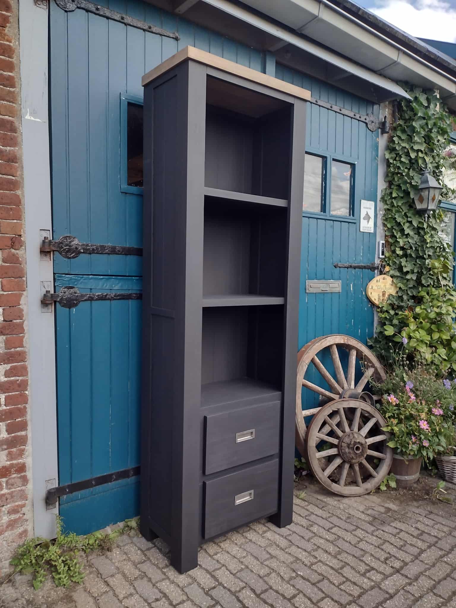 Stoere boekenkast in de kleur mat zwart en houten bovenrand. Direct leverbaar en binnen een week bij u thuisbezorgd. Ons atelier is ook dagelijks op afspraak geopend.