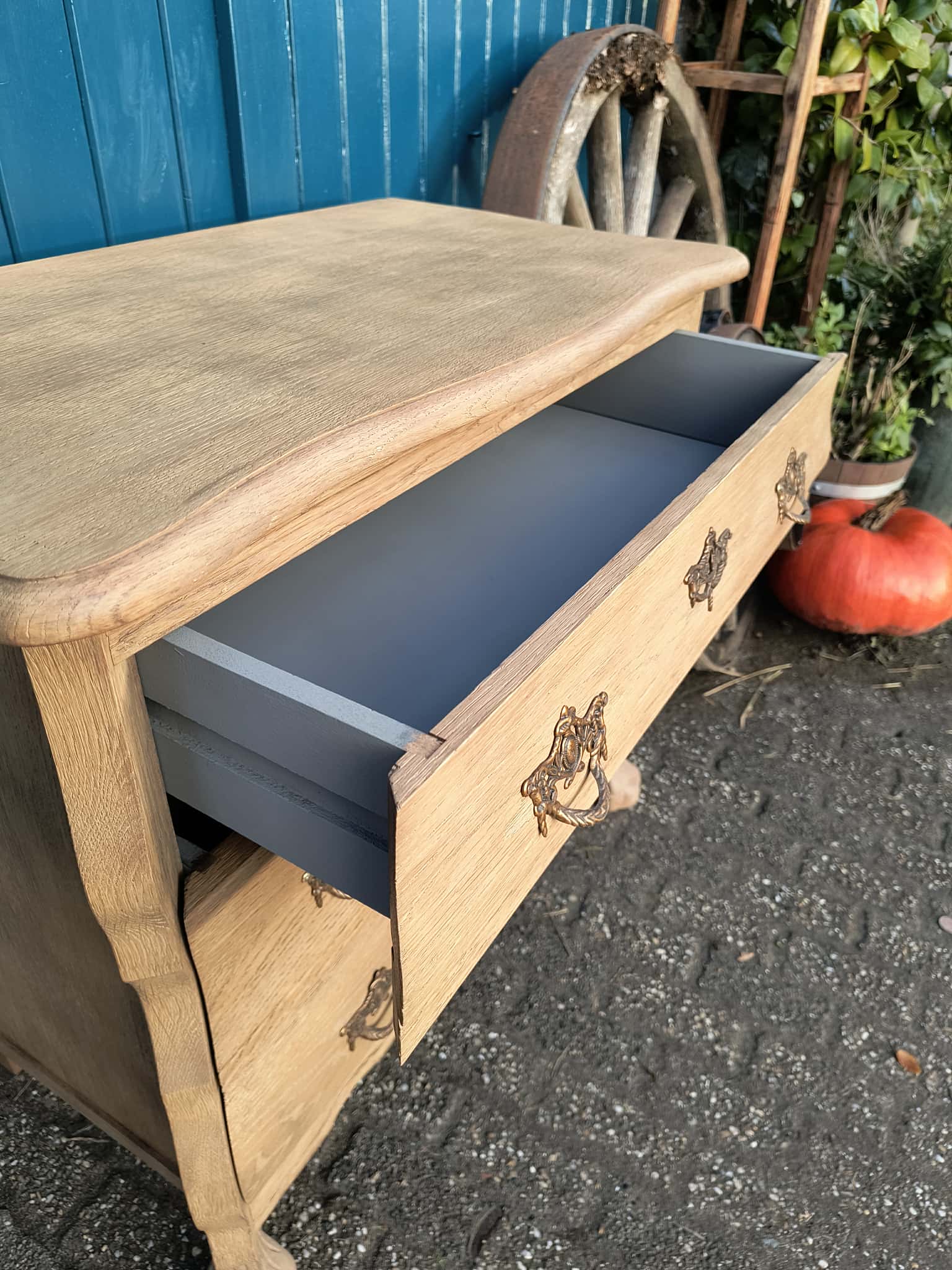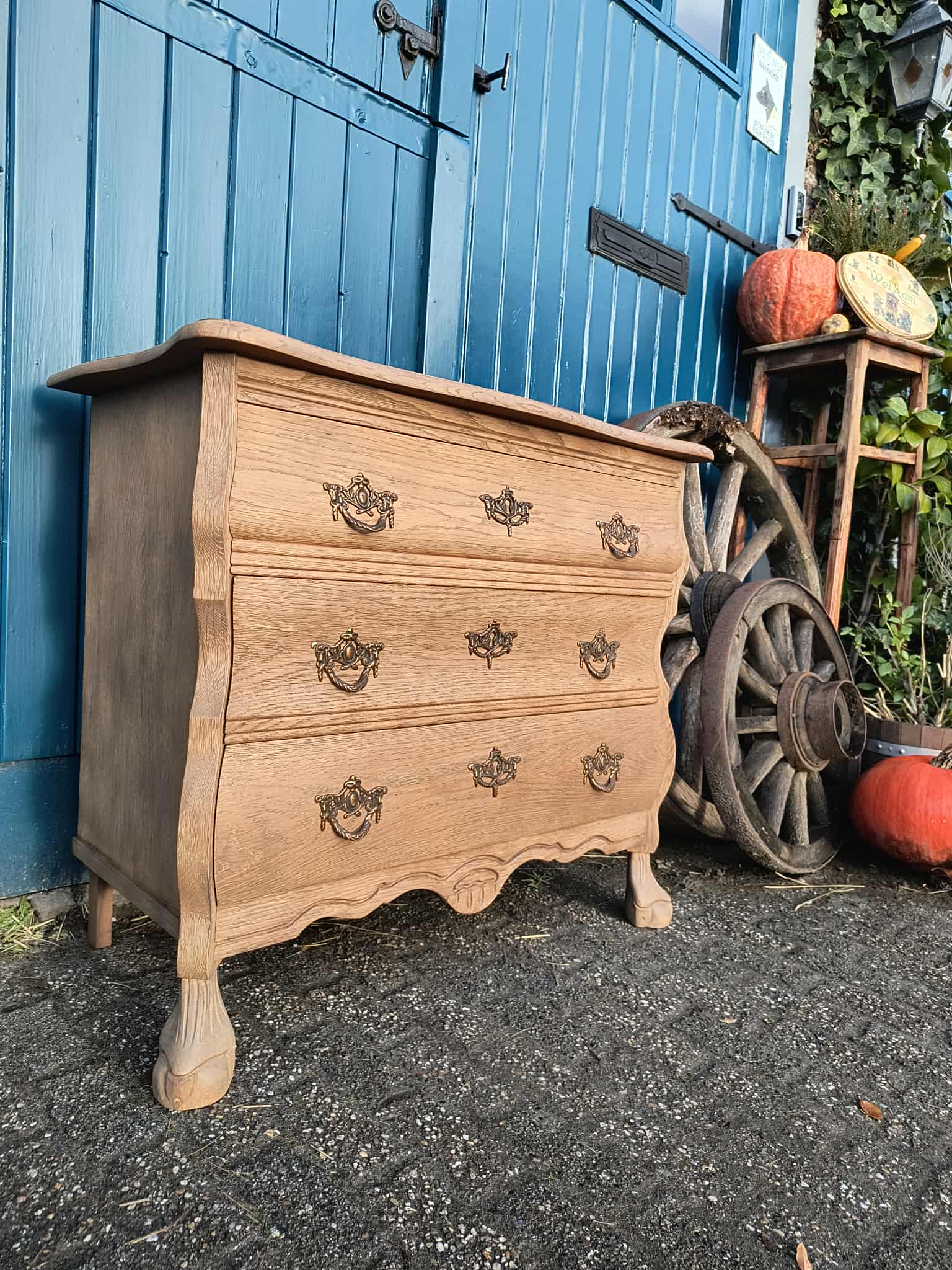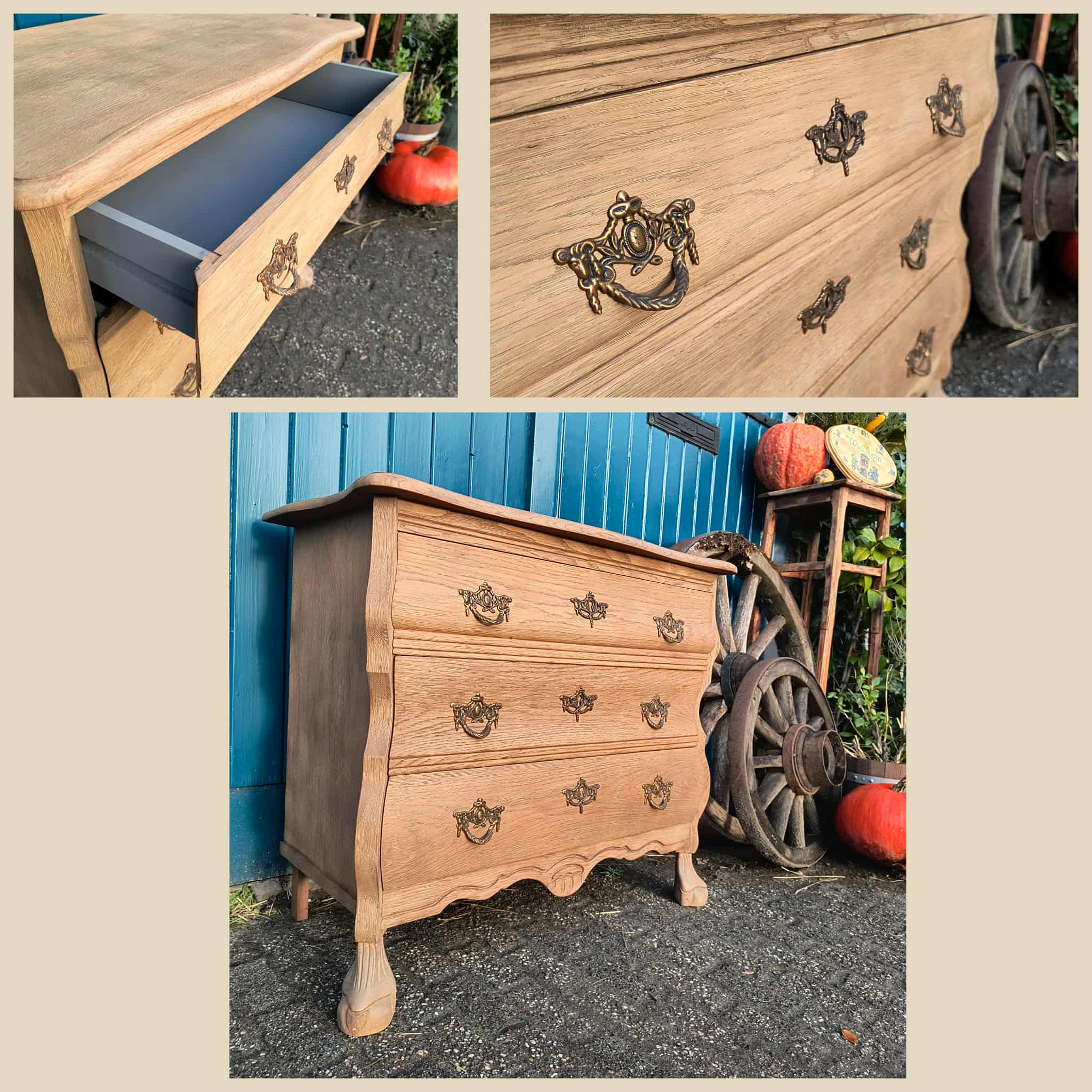 Dit toffe vintage buikkastje hebben wij gezandstraald. We hebben het hout behandeld met de kleur “vergrijsd noten” De binnenkant van de lades is grijs. Binnen een week bij u thuisbezorgd en dagelijks op afspraak te zien in onze showroom.