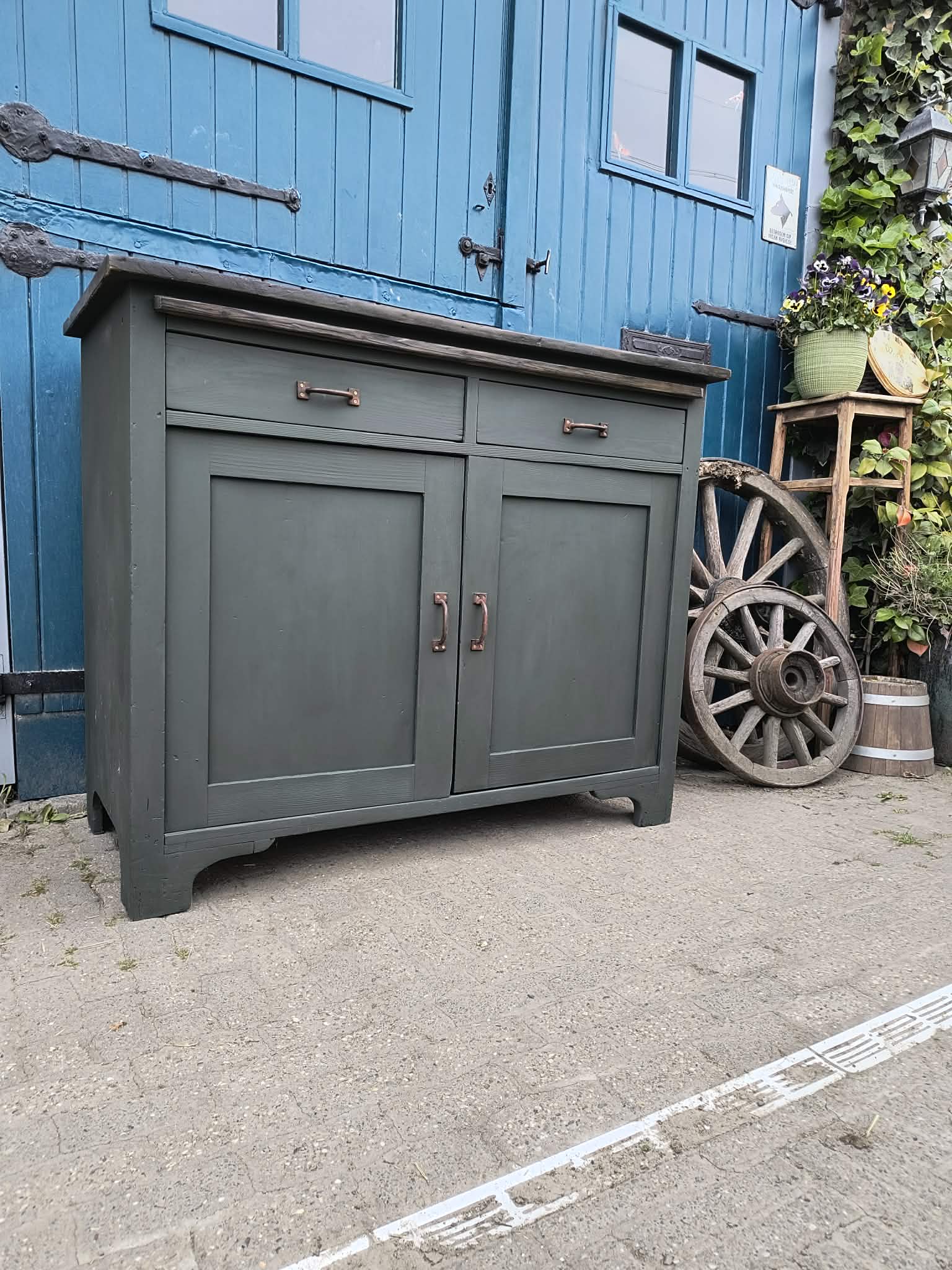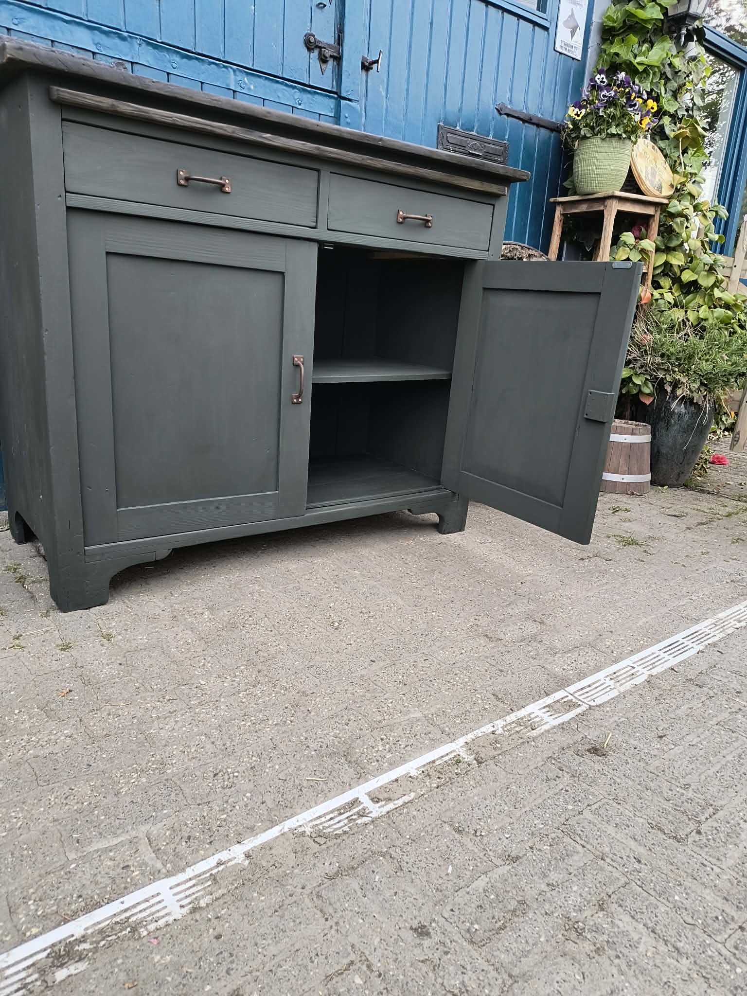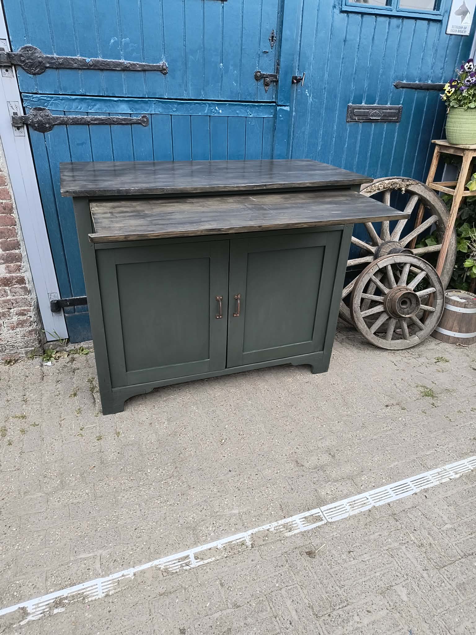 Deze stoere kast is in de kleur army green. De kast heeft ook een uitschuifbaar blad dus ook ideaal te gebruiken als bureau of commode. De handgrepen zijn van geroest staal. De bladen zijn in de kleur black wash. Per direct leverbaar en binnen een week bij u thuisbezorgd. Ook dagelijks te bezichtigen in onze showroom op afspraak.