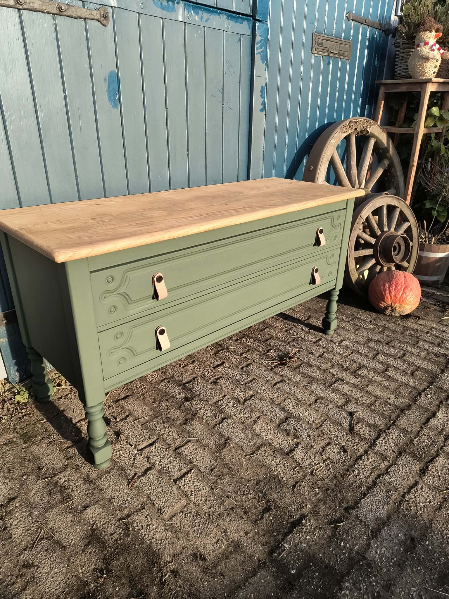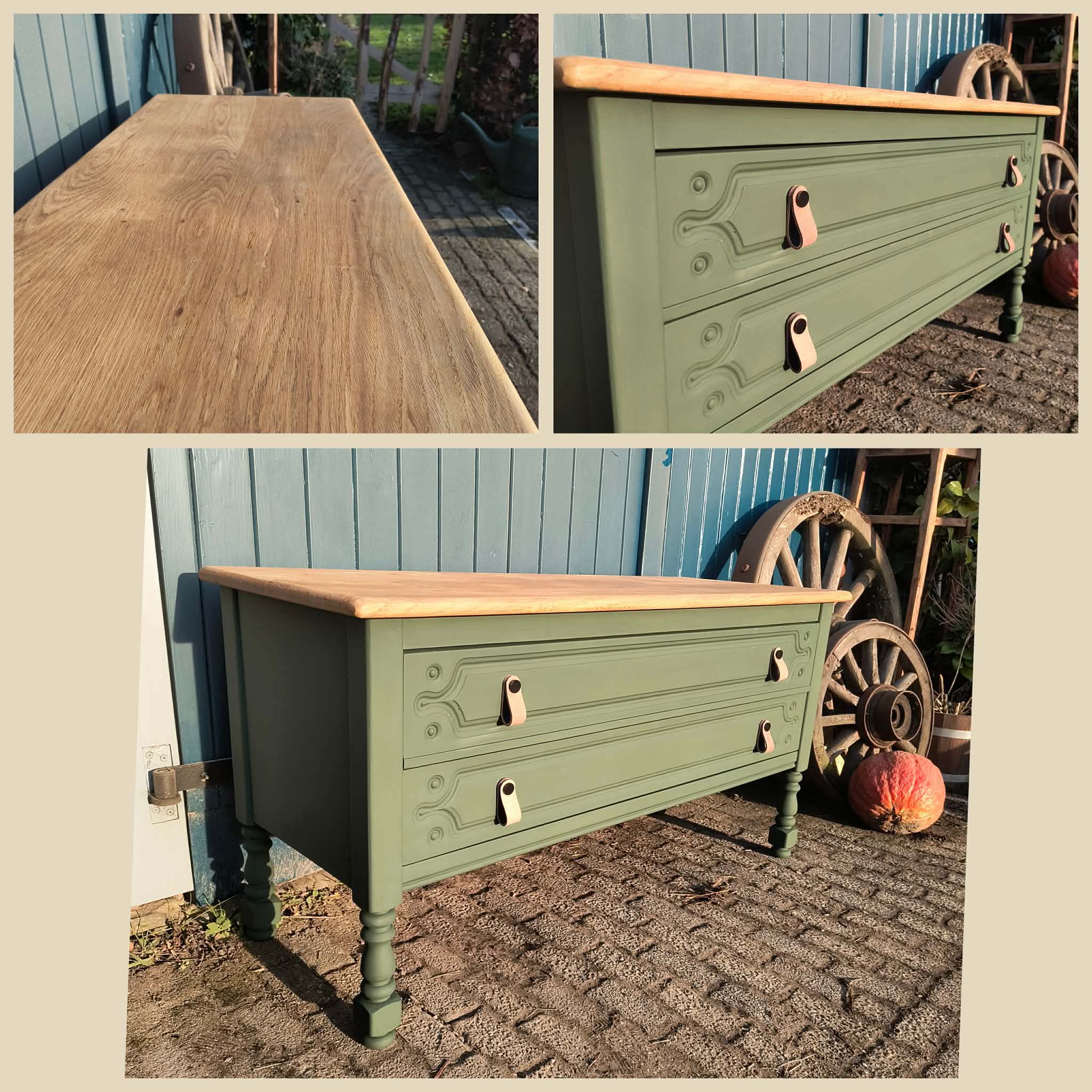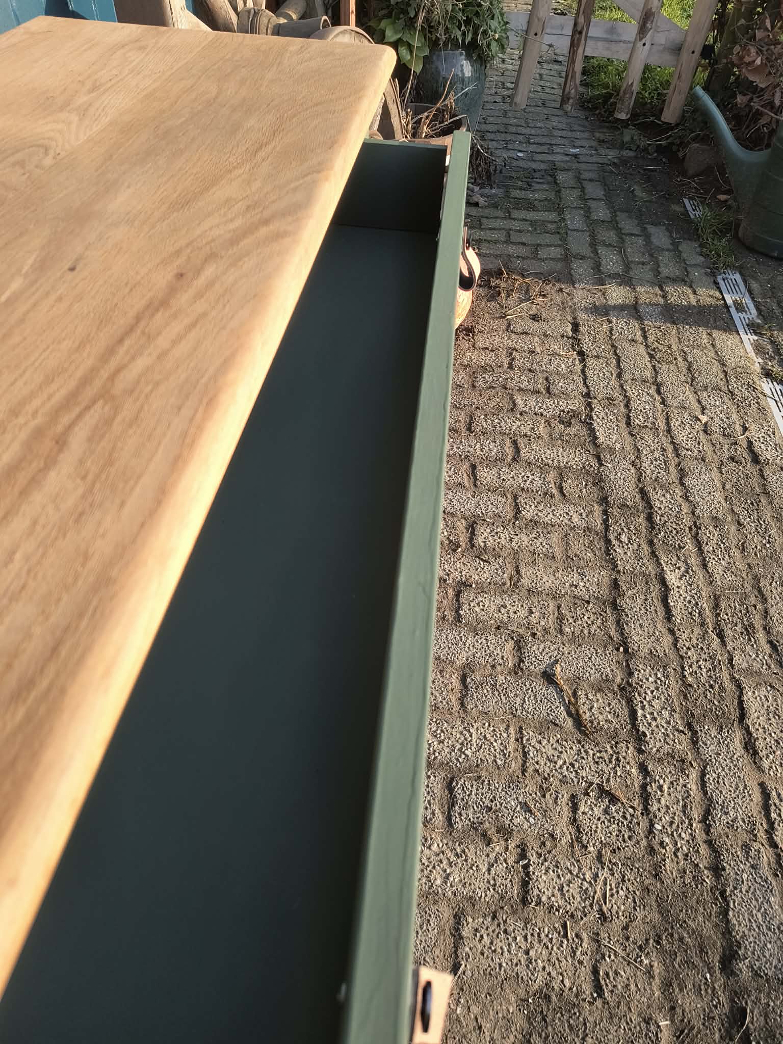 Groene ladekast met gezandstraald eiken bovenblad. Het blad is behandeld. Per direct leverbaar en binnen een week bij u thuisbezorgd. Ook dagelijks te bezichtigen in onze showroom op afspraak.