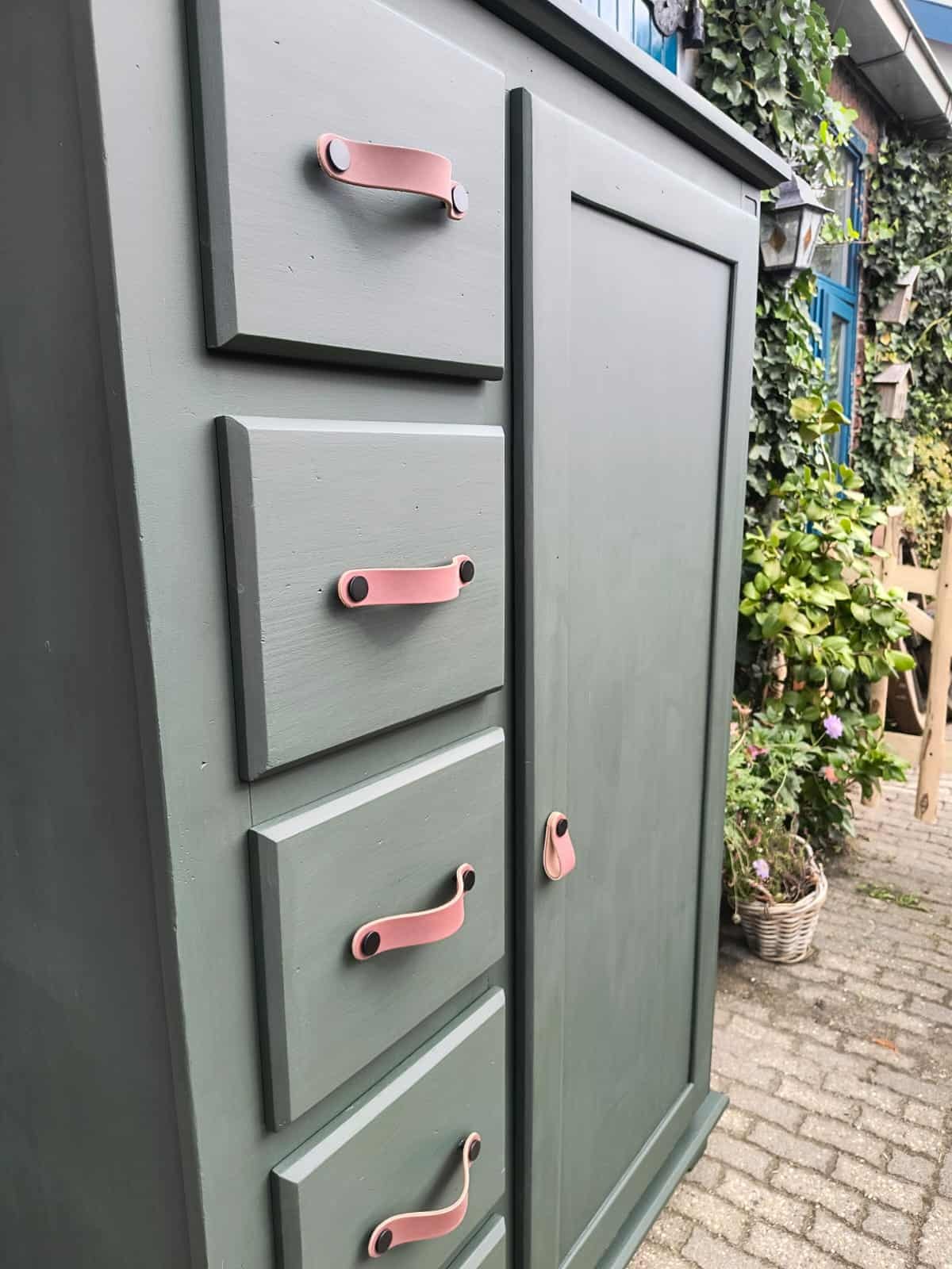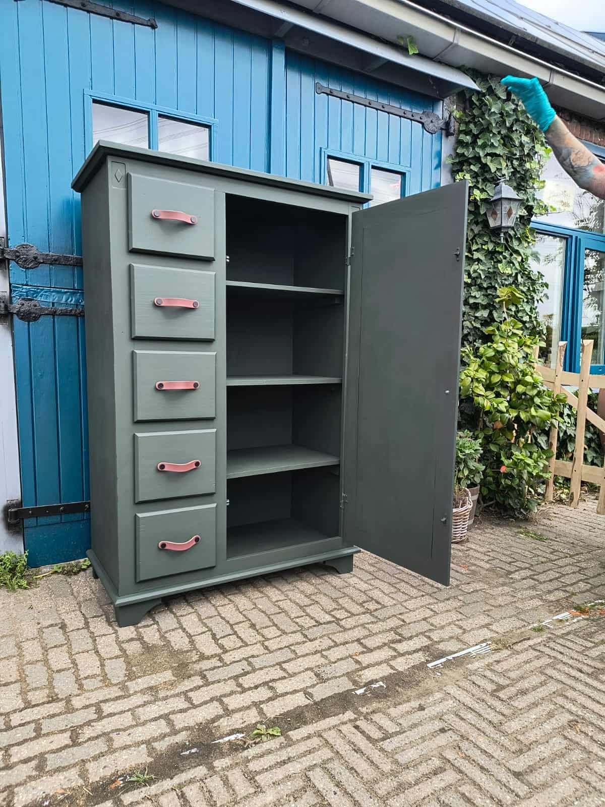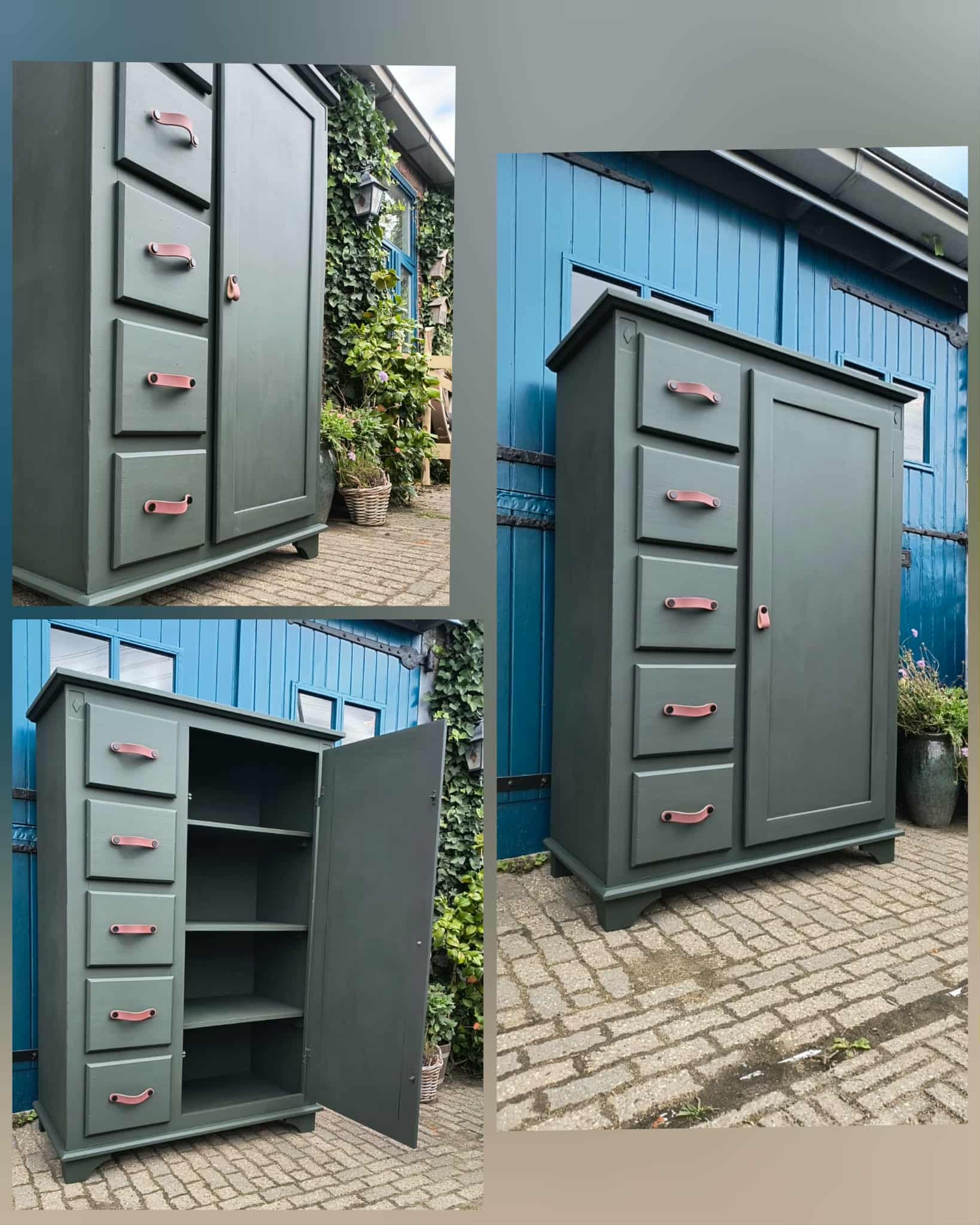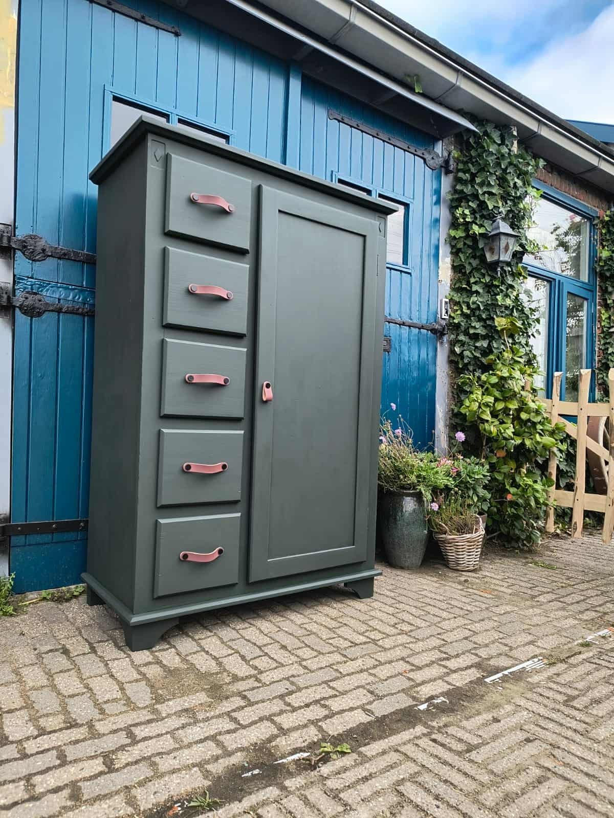 Strakke army groene spekkast meidenkast van massieve kwaliteit. Cognac lederen grepen kunnen ook geleverd in een zwarte variant. Per direct leverbaar. Dagelijks te bezichtigen in ons atelier op afspraak. Binnen een week bij u thuisbezorgd.