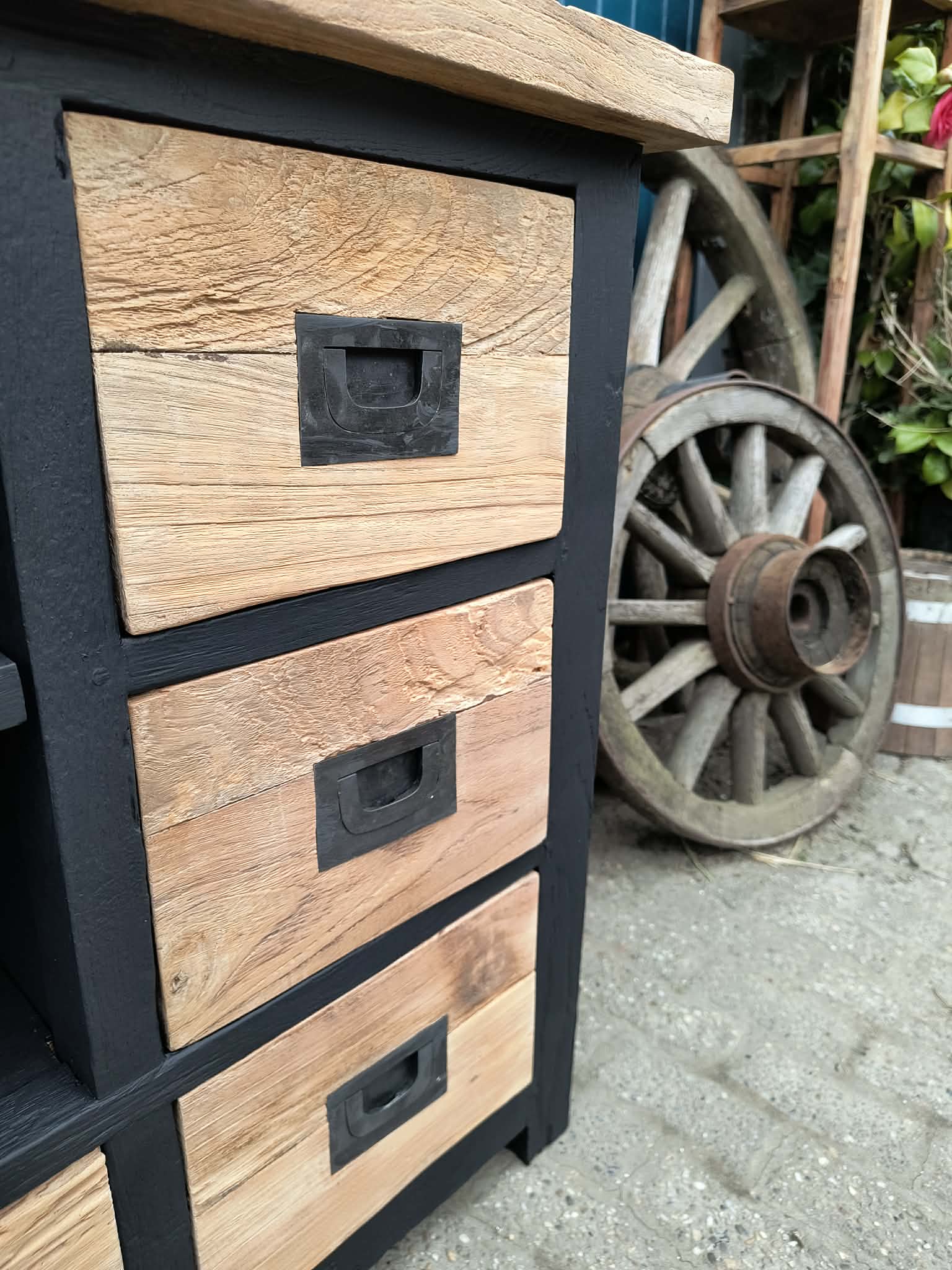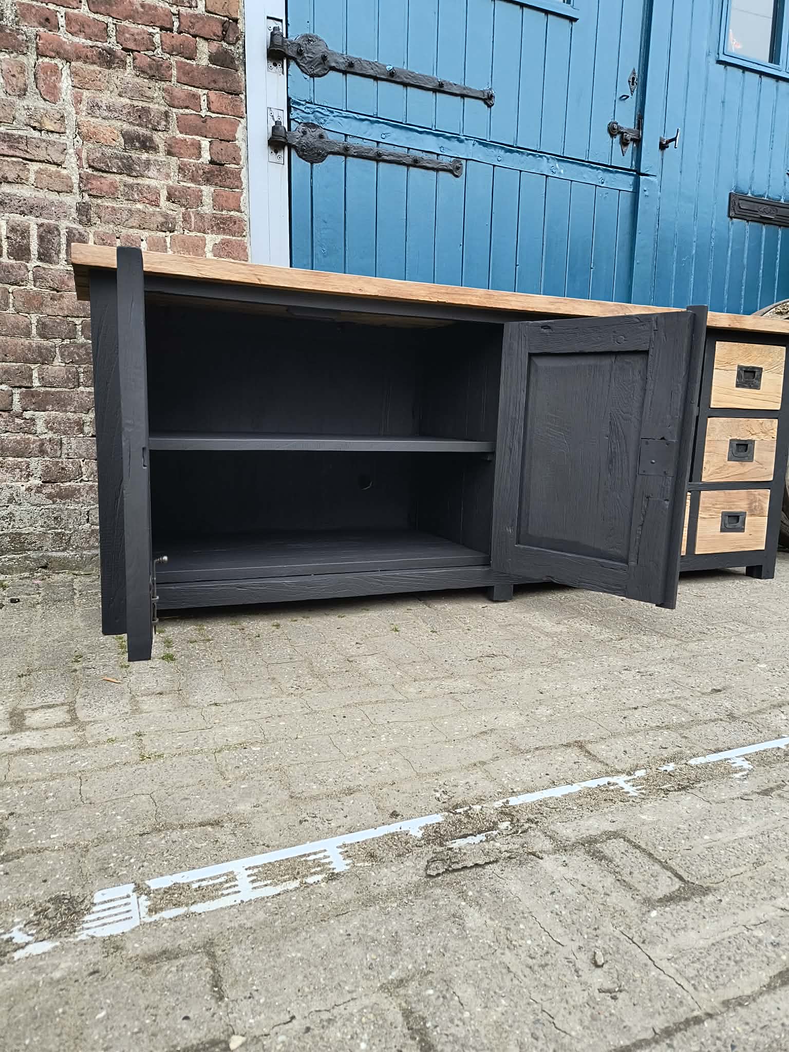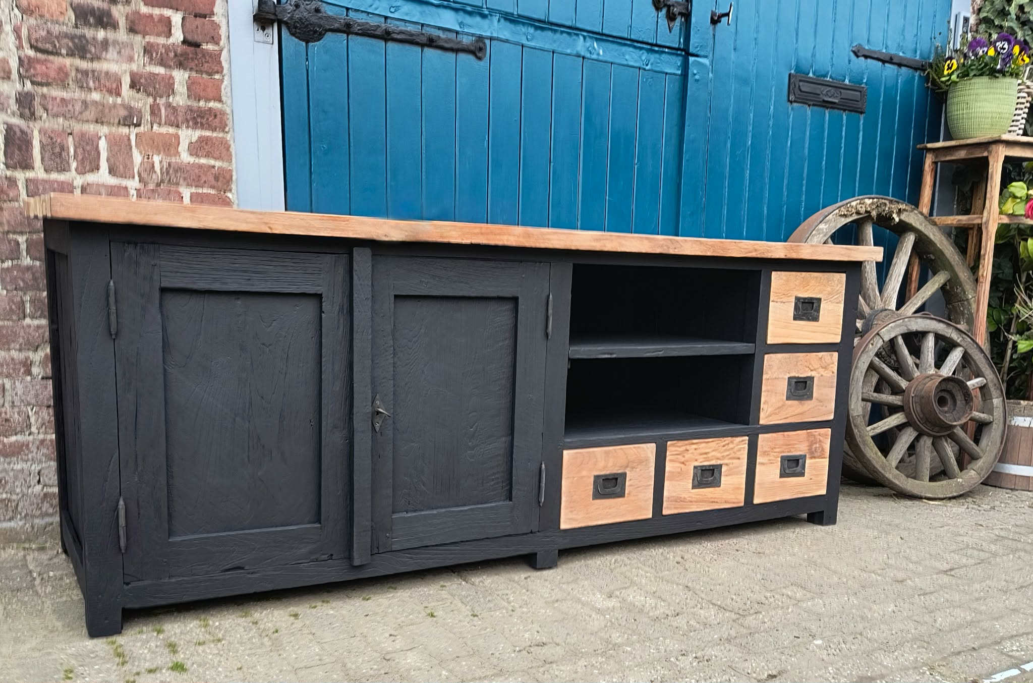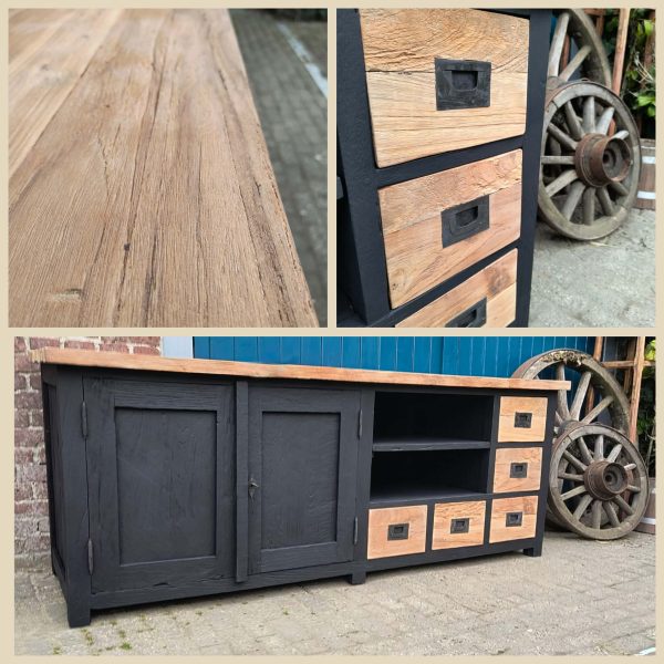 prachtig massief teakhout tv meubel mat zwart. We hebben dit meubel gezandstraald en behandeld. Per direct leverbaar en binnen een week bij u thuisbezorgd. dagelijks te bezichtigen in onze showroom.