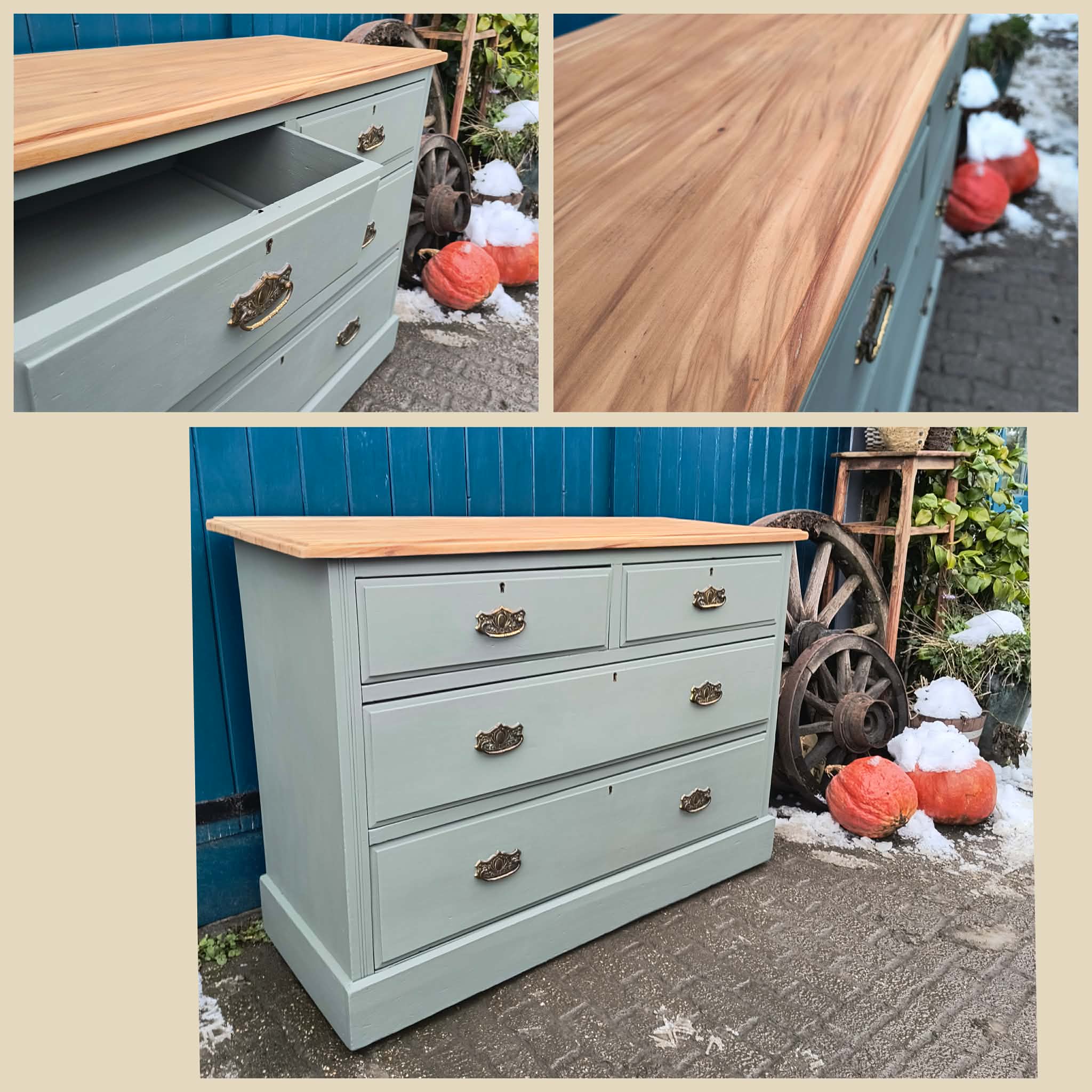 prachtige vintage ladekast in de kleur eucalyptus groen . Het bovenblad is van notenhout en hebben we gezandstraald en behandeld. Per direct leverbaar. Binnen een week bij u thuisbezorgd. Dagelijk is onze showroom in rilland op afspraak geopend.
